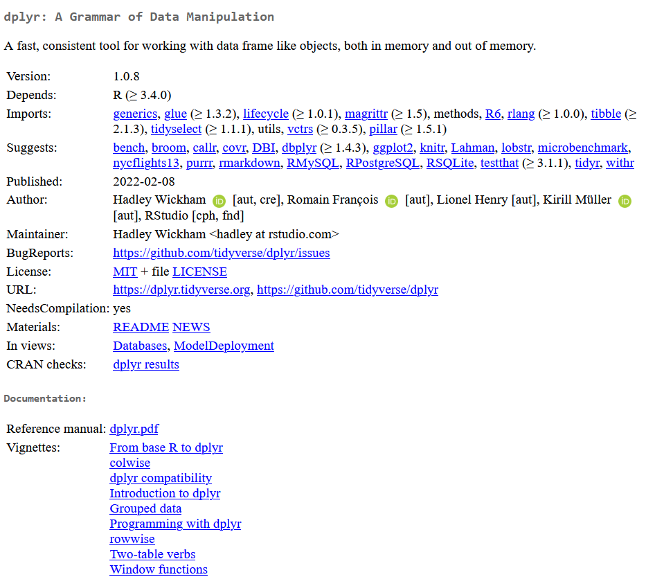 dplyrno CRAN: - Nela é possível ver a partir de qual versão do R funciona, os pacotes necessários para o seu funcionamento (Imports), os autores e sites.