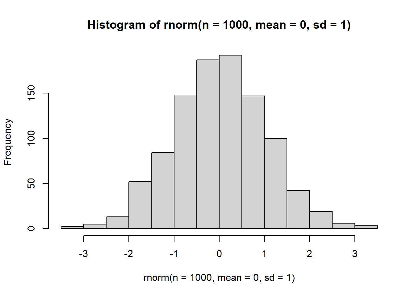 hist(rnorm(n=1000, mean=0, sd=1)) # Histograma dos números gerados