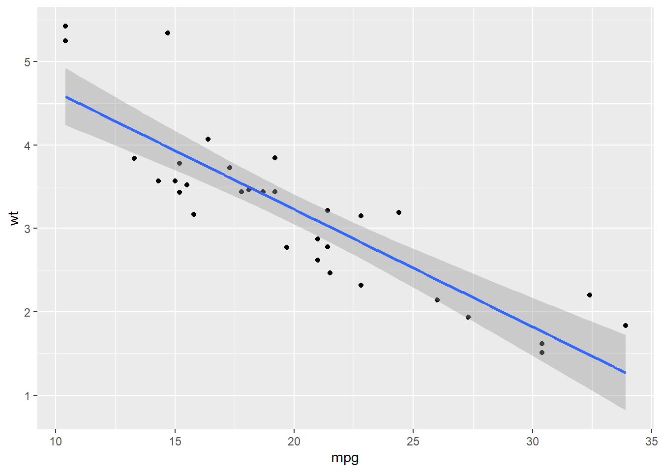 g = ggplot(data=mtcars, aes(mpg, wt)) # Criando a base do gráfico