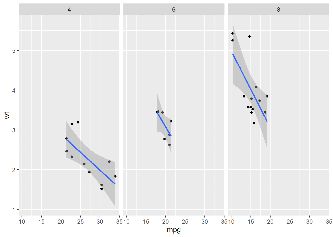 g + geom_point() + geom_smooth(method="lm") + facet_grid(. ~ cyl) # agrupando por nº cilindros horizontalmente