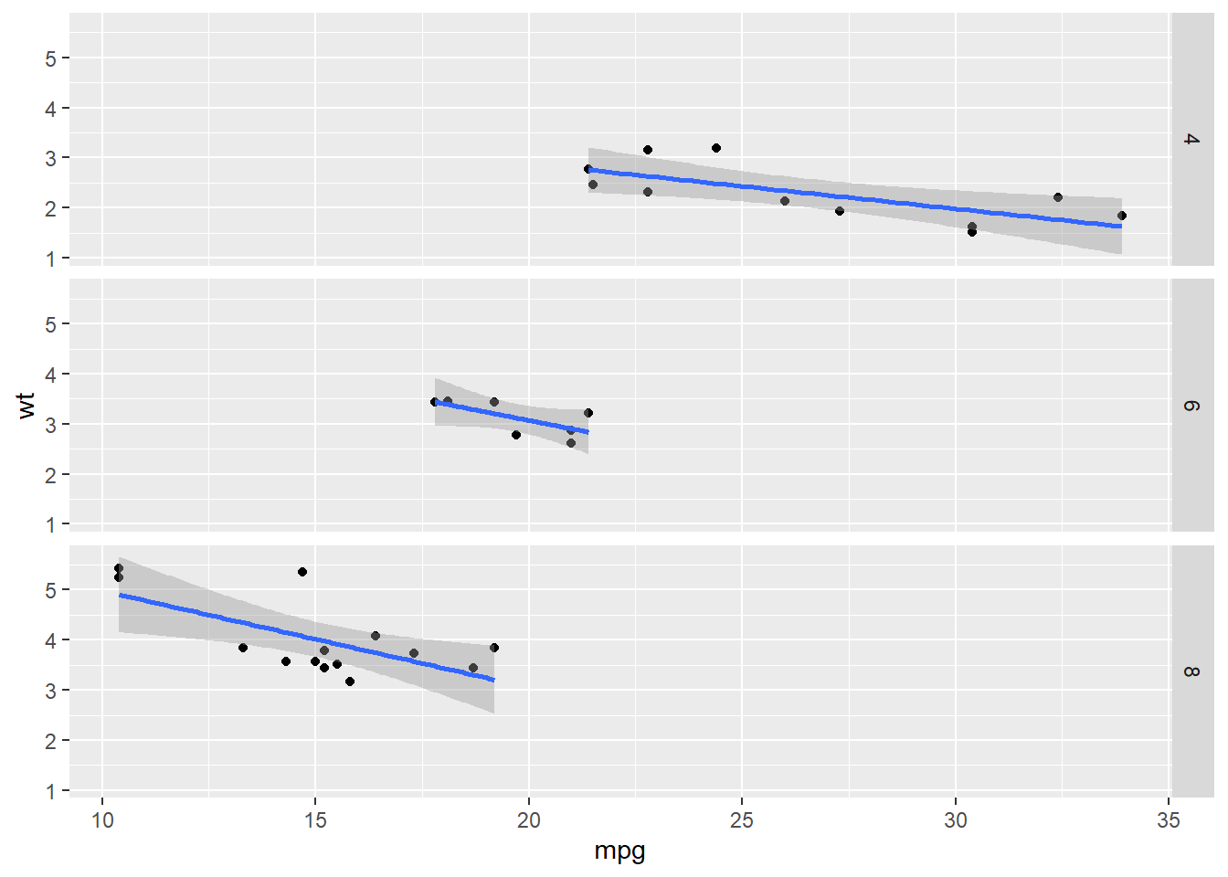 g + geom_point() + geom_smooth(method="lm") + facet_grid(cyl ~ .) # agrupando por nº cilindros verticalmente