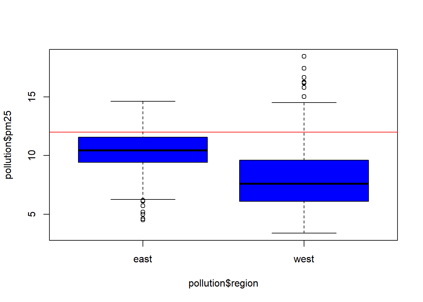 - Para múltiplos boxplots, usamos `boxplot(pollution$pm25 ~ pollution$region, col="blue")