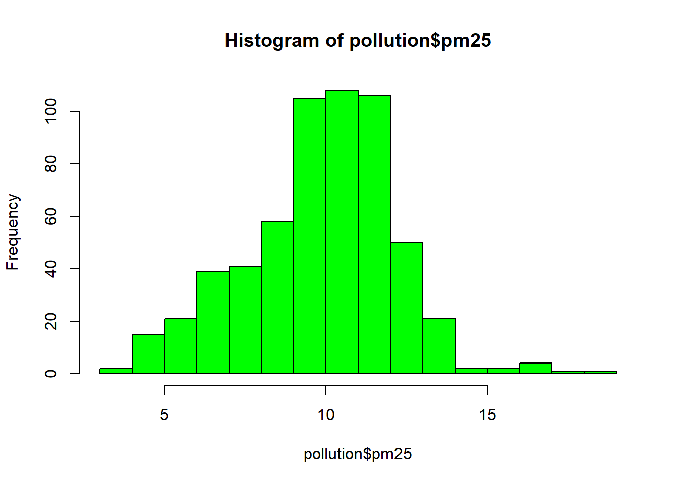 hist(pollution$pm25, col="green")