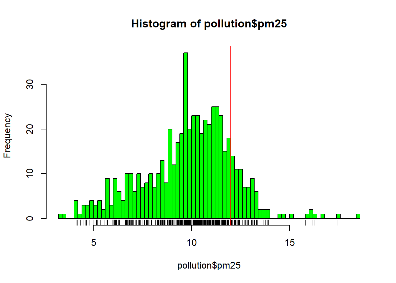 rug(pollution$pm25) # Traços dos valores da amostra abaixo do histograma