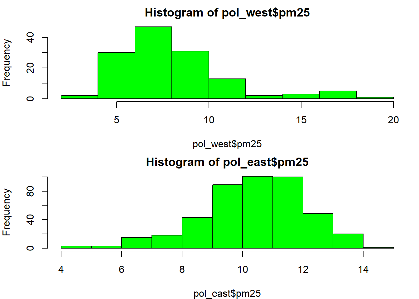 plot(pol_east$latitude, pol_east$pm25, main="East")