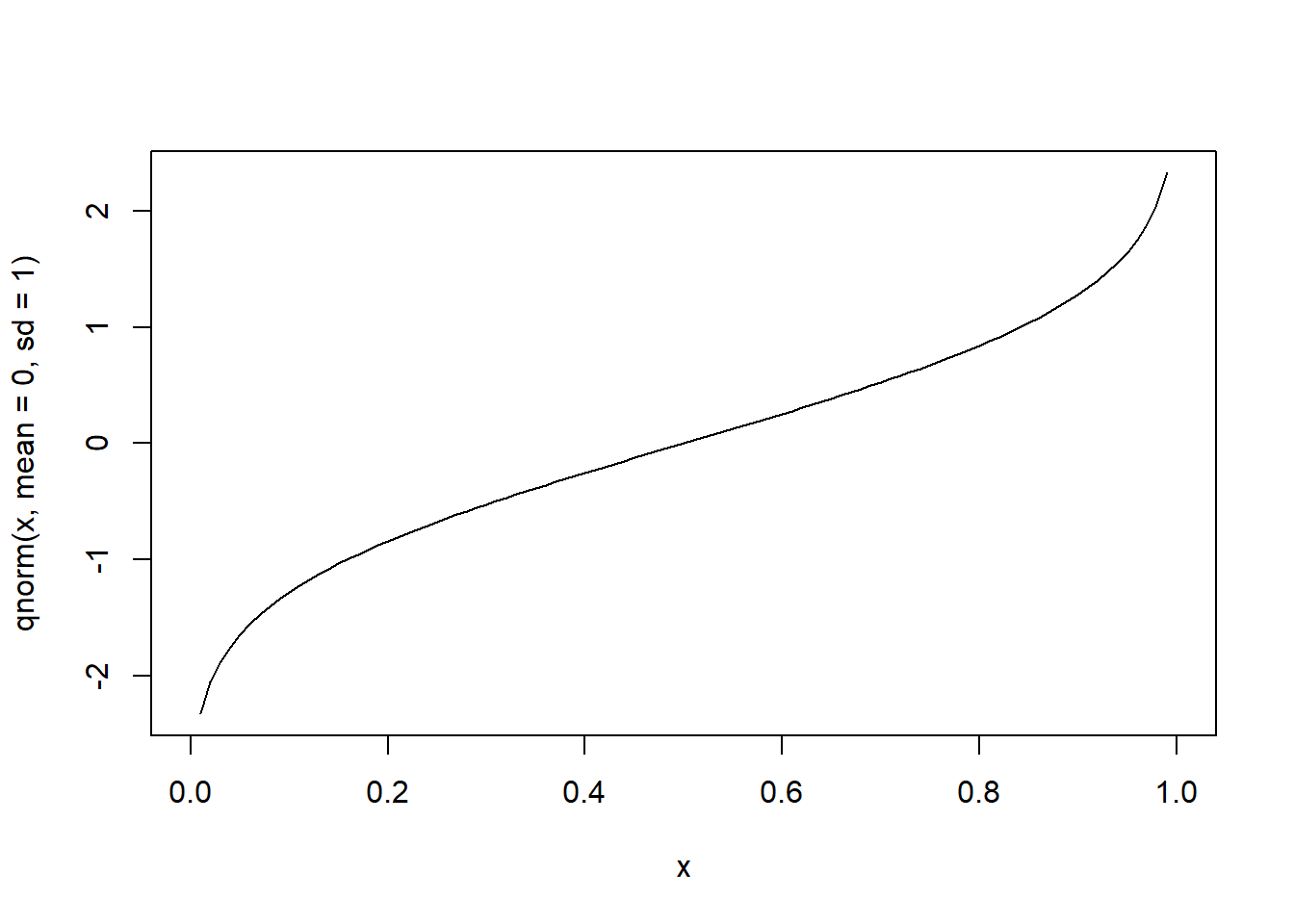 curve(qnorm(x, mean=0, sd=1), from=0, to=1)
