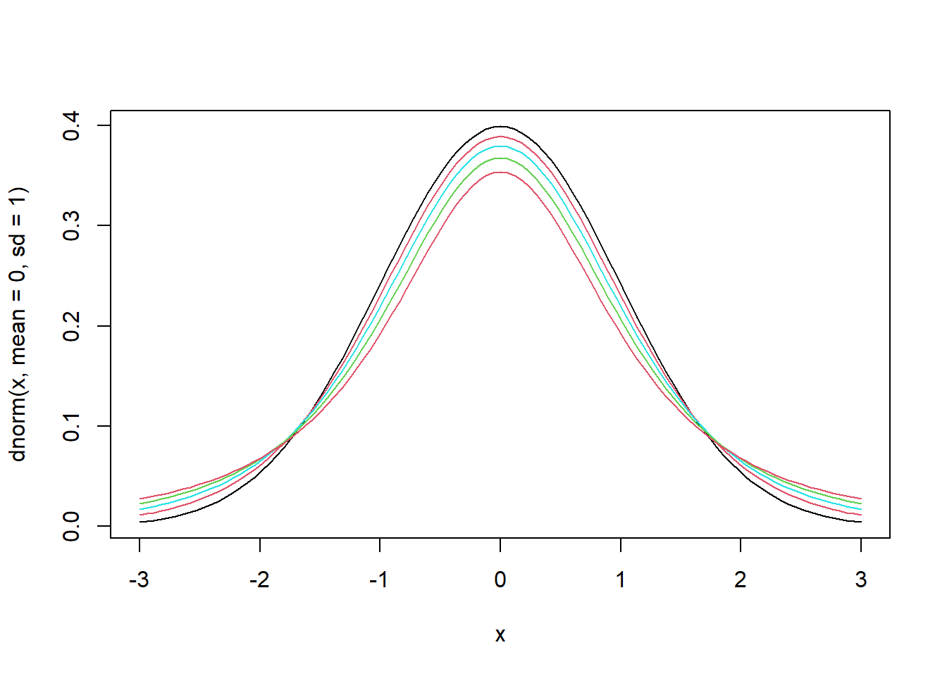 curve(dt(x, df=n), from=-3, to=3, col=n, add=T) # fdp t-student
