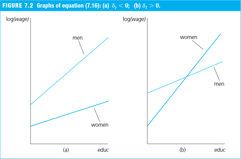 \begin{align} \log(\text{wage}) = &\beta_0 + \beta_1 \text{female} + \beta_2 \text{educ} + \delta_2 \text{female*educ} \\ &\beta_3 \text{exper} + \beta_4 \text{exper}^2 + \beta_5 \text{tenure} + \beta_6 \text{tenure}^2 + u \end{align} em que: