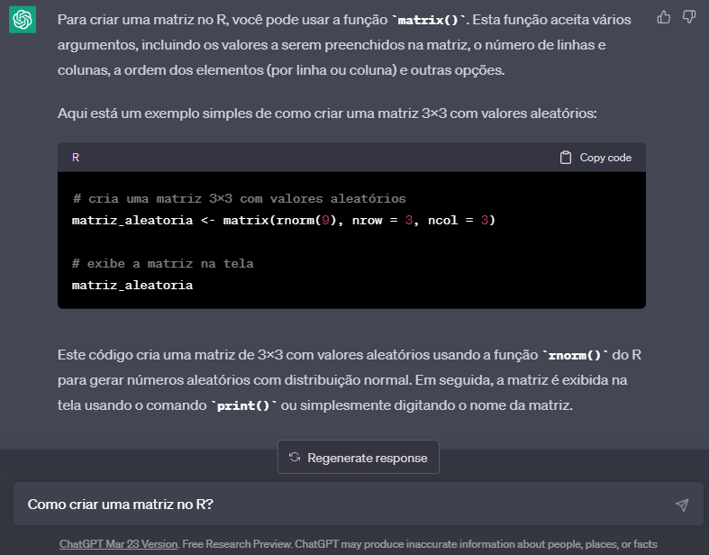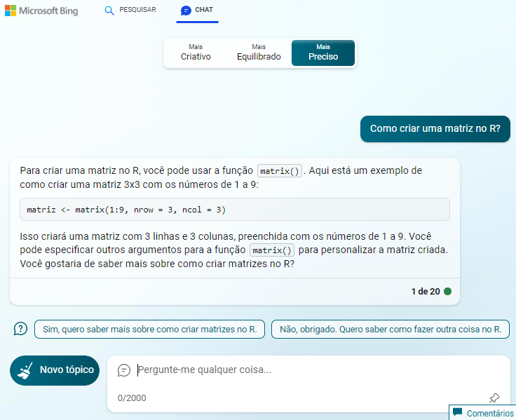 - É possível ter um assistente para aprender a usar o R usando o chatbots como ChatGPT (https://chat.openai.com) e Bing Chat (https://www.bing.com/chat).