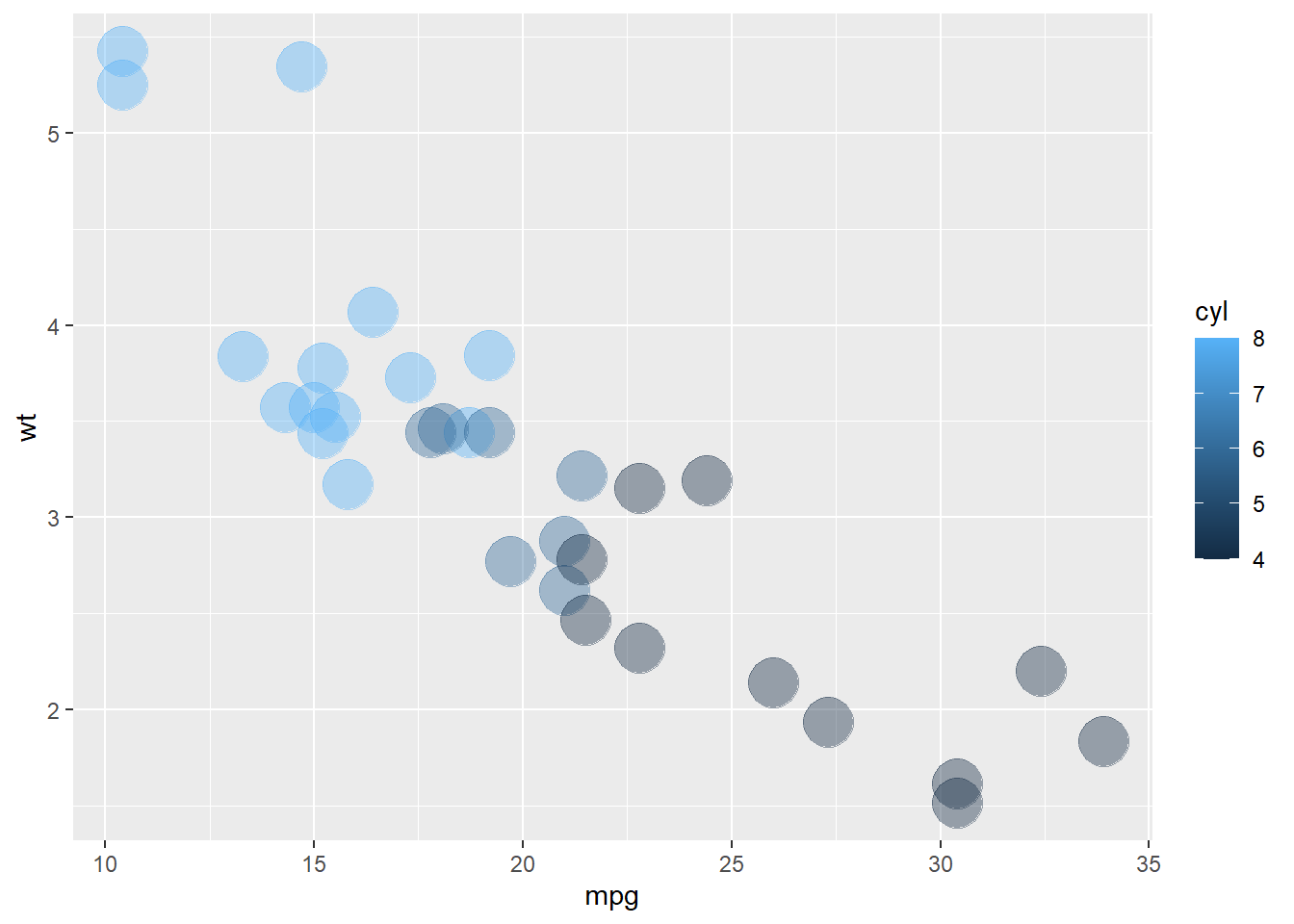 g + geom_point(aes(color=cyl), size=9, alpha=0.4) # colorindo por variável - precisa usar aes()