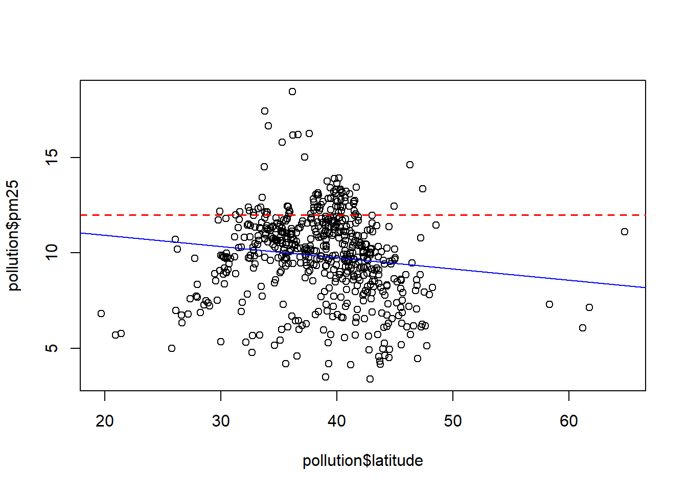 abline(lm(pm25 ~ latitude, data=pollution), col="blue")