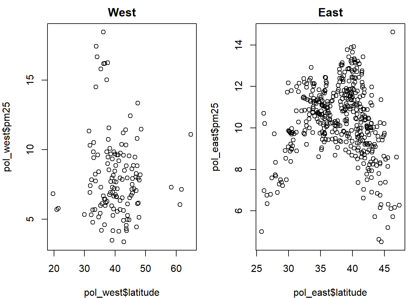plot(pol_east$latitude, pol_east$pm25, main="East")