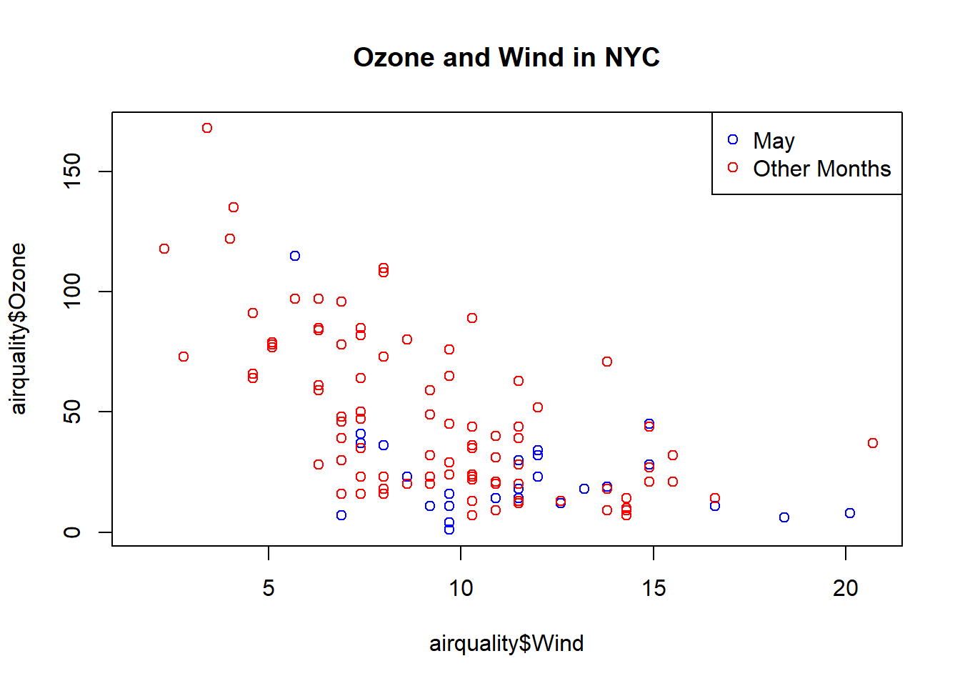 points(air_may$Wind, air_may$Ozone, col="blue")