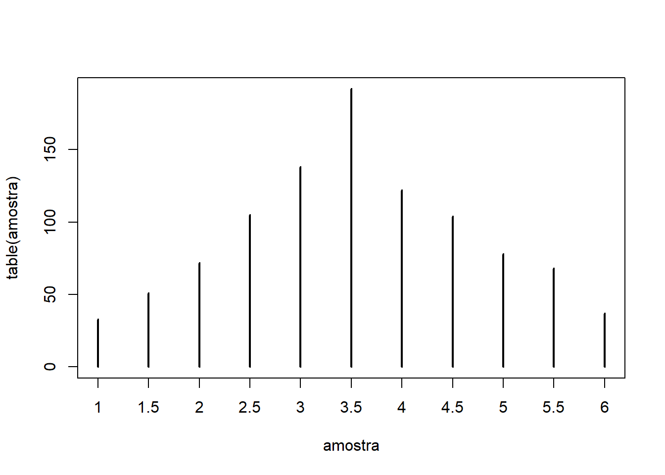 table(amostra) # tabela com contagem das médias de 2 jogadas