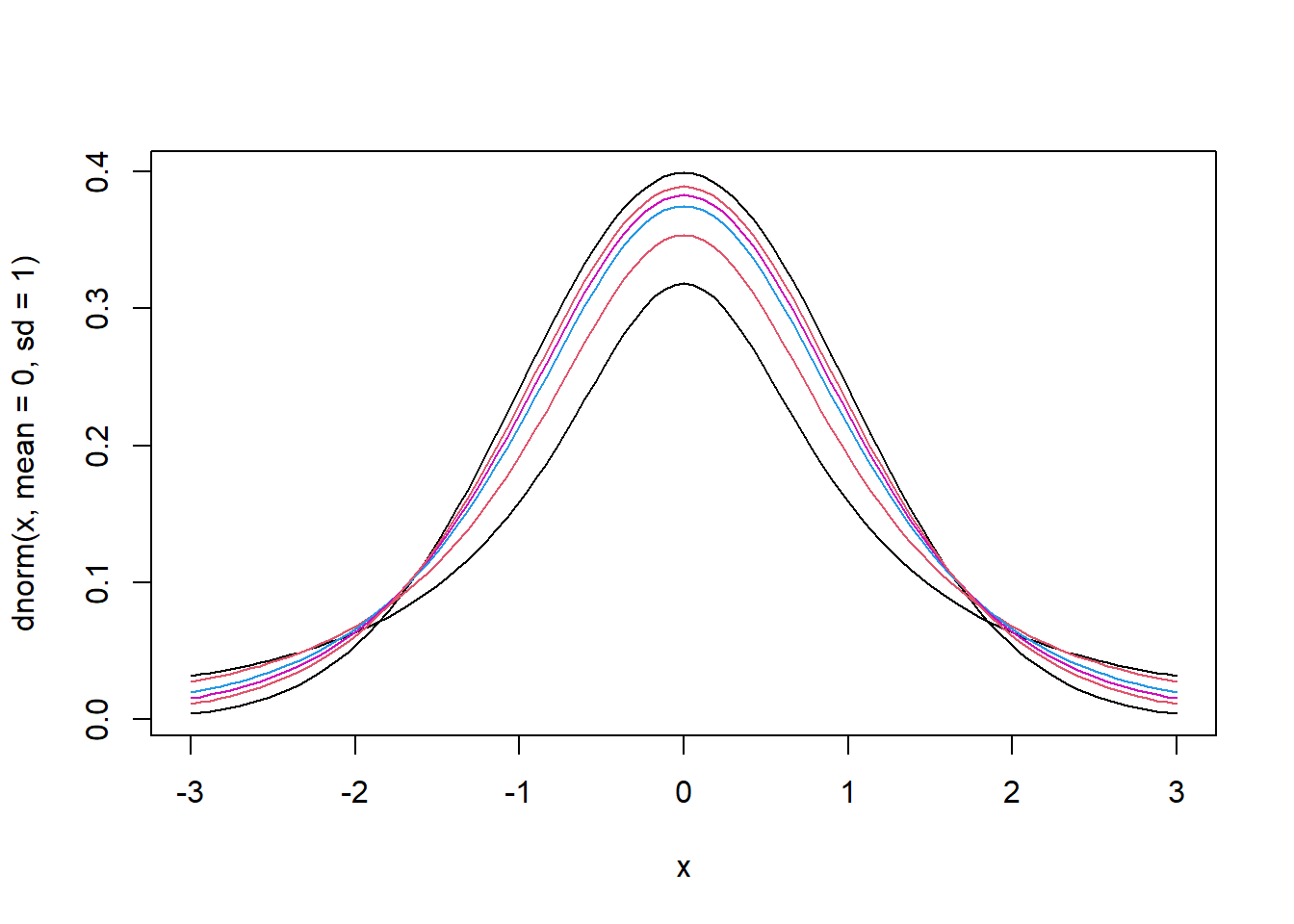 curve(dt(x, df=n), from=-3, to=3, col=n, add=T) # pdf t-student