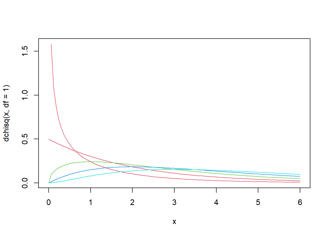 curve(dchisq(x, df=1), from=0, to=6, col=n) # pdf qui-quadrado