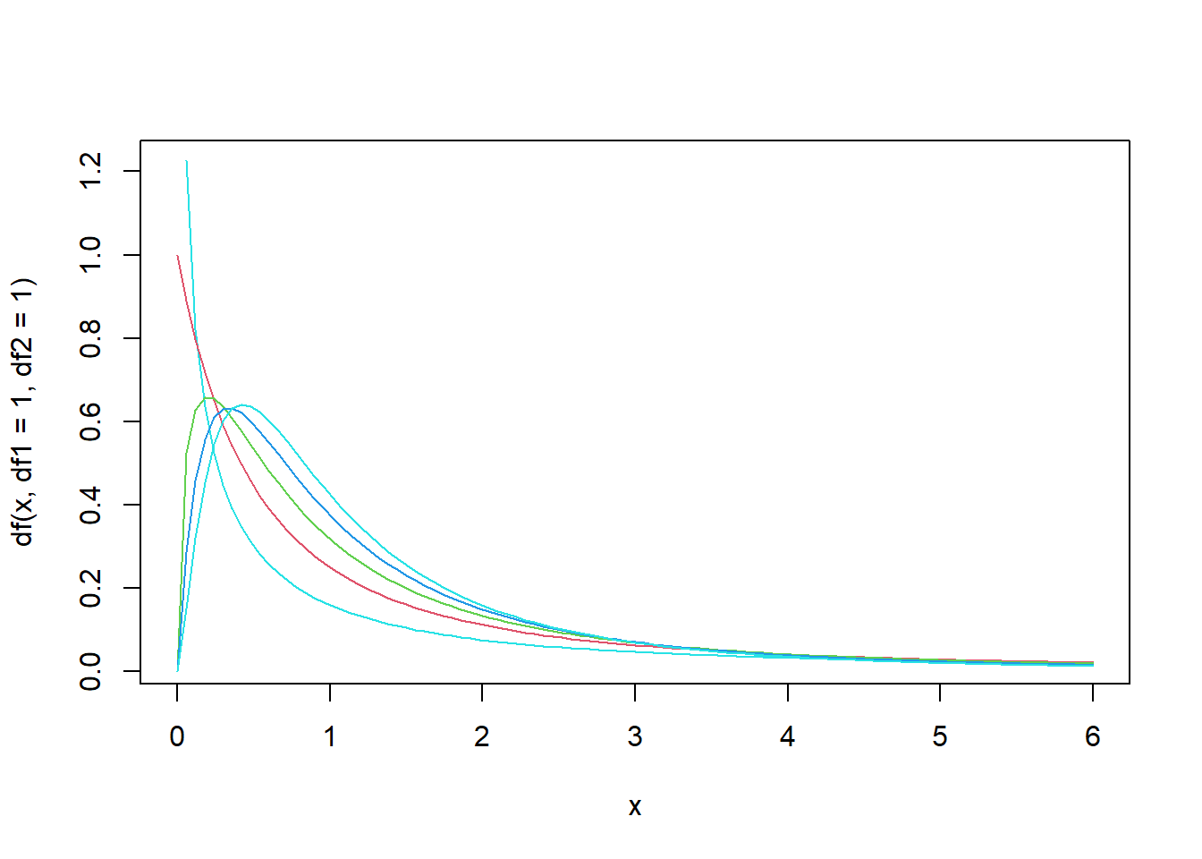 curve(df(x, df1=1, df2=1), from=0, to=6, col=n) # pdf F
