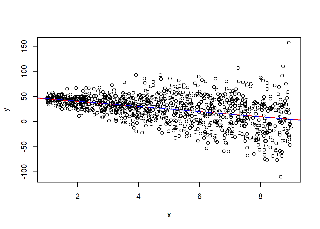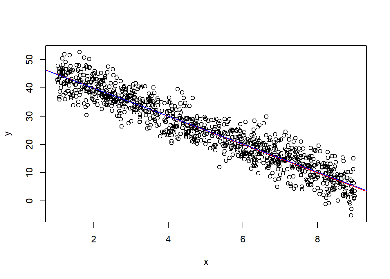 abline(lm(y ~ x), col="blue") # modelo estimado